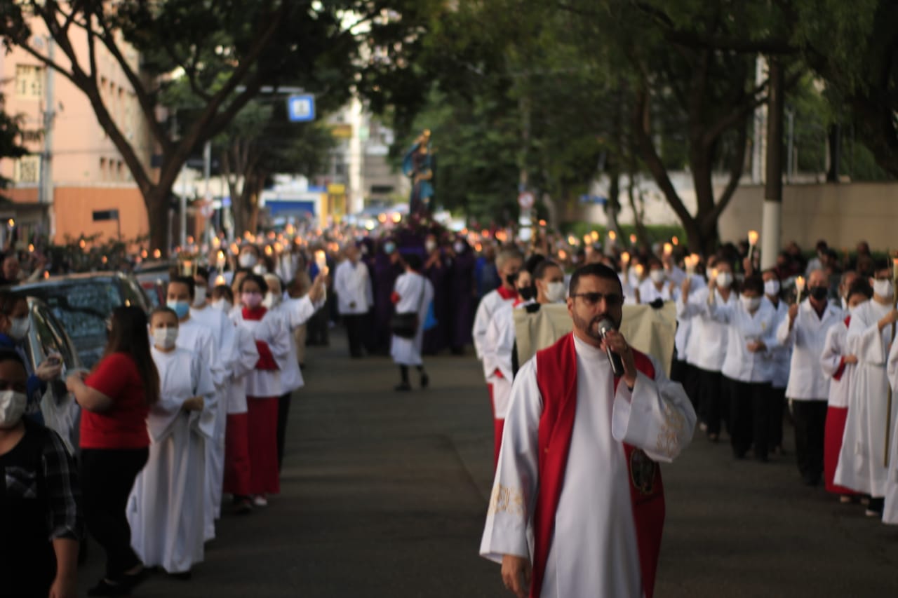 Re. Rarden falou do encontro do sofrimento, de dor, entre a mãe e o filho, comparando com as mães de hoje, que vêm seus filhos chicoteados pela violência, condenados pela dependência, feridos pela falta de sonhos: “Quantas mães que sofrem a perda de seus filhos para o escárnio da sociedade, condenada pela falta de amor, misericórdia e de justiça. Demonstração da necessidade de nos encontrarmos também com nosso próximo, do cuidado, partilha, presença na vida dos outros, sem olhar hipócrita e egoísta. Sem isolamento, como o da pandemia. Anseio de encontrar Deus, que nos ama tanto…  Selemos esse dia com nossa oferta a Deus. Invistamos o nosso tempo nas coisas de Deus. A rosa é o singelo símbolo do paradoxo, tem espinho que machuca e odor, o perfume da rosa. Sejamos marcados com o espinho do nosso pecado, que fere a nossa alma e recorda nossa humildade e necessidade da graça e misericórdia de Deus. Mas saibamos que perfume que precisamos exalar entre nós é o perfume do amor. Amemos mais no tempo que Deus nos concede”. O Pe. Rarden finalizou sua homilia clamando com o povo presente, apontando para a imagens dizendo: “Senhor dos passos tem piedade de nós, Senhora das Dores, rogai por nós!”