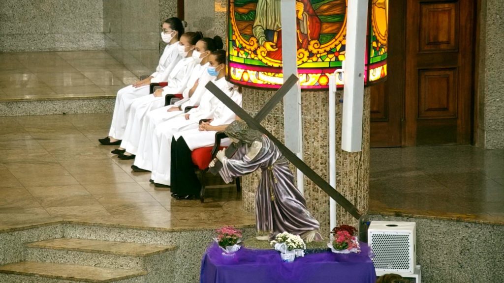A principal celebração deste dia da Semana Santa foi a Missa com a pregação sobre Nosso Senhor dos Passos, às 19h30, presidida pelo Pe. Guilherme César Silva Rocha,scj. Na acolhida, o Pe. Guilherme lembrou da preparação de 40 dias e que esta é a semana maior. E que nessa celebração contemplaremos os passos de nosso Senhor Jesus Cristo como ao monte Calvário, e seguindo-o, não demos espaço em nossa vida para angústia, desespero ou medo. Mas abracemos a nossa cruz, porque seguimos aquele que abraçou a cruz da humanidade.