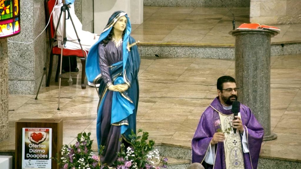 Em sua homilia, Pe. Cleiton disse que muitas vezes não compreendemos os mistérios de Deus e de Jesus. E que na Semana Santa, é mostrado o caminho a ser percorrido, o desafio da dor e do sofrimento. Às vezes somos dominados pelo medo e pelas dúvidas e nos distanciamos do Projeto de Deus. Temos que ter coragem e atitude, a exemplo da Virgem Maria. Ela, que tem vida de entrega, tanto para as alegrias quanto para os sofrimentos, partilhas e angústias. Na imagem de Nossa Senhora configura toda a dor e podemos sentir o sofrimento da humanidade. Com essa grande ligação de amor da mãe, vamos tendo força para caminhar. Deus dá oportunidade de Maria tornar-se a nova Eva e Jesus o novo Adão. Nas 7 dores de Maria entendemos como Deus fala pela Sua Palavra e dá sinais de vida, onde percorremos essa graça. Pe. Cleiton continua, e vai citando todas as dores de Nossa Senhora, dizendo que Maria não se distancia de Deus, mas abraça o seu projeto de amor.