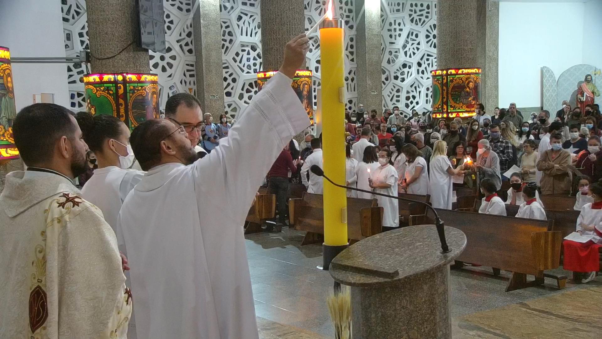 Durante o tempo, teremos momentos altos e baixos, sempre olhando para Jesus. Durante este Tempo da Páscoa, teremos esta luz que é Jesus (apontando para o Círio Pascal, aceso, sobre o altar). Essa é oportunidade para viver essa alegria de forma intensa. Por dentro, experimentamos essa força de Deus. Força para encarar os dilemas da vida: a morte, as tristezas, as injustiças, incompreensões… A gente precisa pisar nosso ego para dar espaço para Cristo. Vivemos esse período de Páscoa, em que somos nova criatura. Que olhar para o círio não vemos apenas uma vela, mas a luz de Cristo! A luz verdadeira, porque não somos criados para o tempo, mas para a eternidade. É o que acreditamos. Viva Jesus Cristo ressuscitado! (2x) Viva Jesus!”, finalizou a sua homilia, o Pe. Daniel, clamando alegremente e o povo respondendo e aplaudindo em seguida.