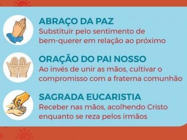 A Conferência Nacional dos Bispos do Brasil (CNBB) emitiu um comunicado aos sacerdotes e ministros para que aconselhem e orientem os fiéis a: receberem a Eucaristia em suas mãos, evitem o abraço e o aperto de mão como gesto de paz e o dar as mãos durante a oração de Pai-Nosso. A CNBB não tem poder de indicar normas para as arquidioceses, mas faz sugestões que podem ser acolhidas pelos bispos.