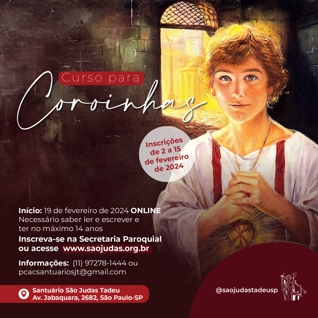 As inscrições para o Curso de Coroinhas 2024 do Santuário São Judas Tadeu estão abertas de 02 a 15 de fevereiro. O curso terá inicio no dia 19/02, sendo esta primeira etapa (teórica) realizada de maneira online pela plataforma de estudos do Santuário (Moodle) por meio do nosso site.