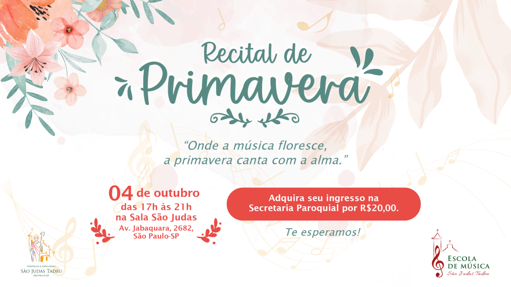 A beleza da estação mais florida do ano será celebrada em um momento especial de música e arte. A Escola de Música São Judas Tadeu realiza no dia 04 de outubro, das 17h às 21h, o Recital de Primavera, na Sala São Judas (Av. Jabaquara, 2682 – São Paulo/SP).