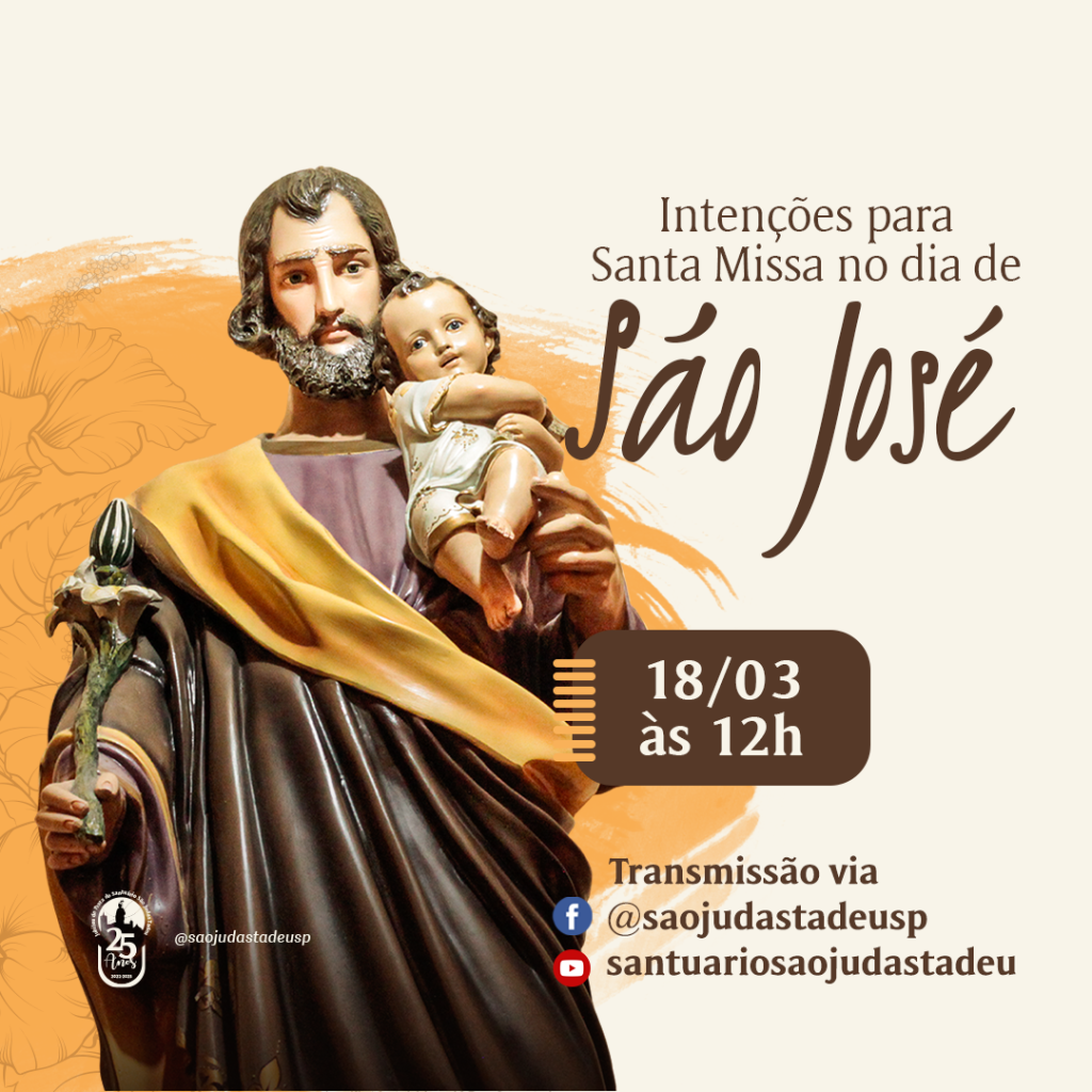 No Santuário São Judas Tadeu, sábado dia 18 de março, será celebrada uma missa em que os devotos poderão enviar suas intenções para a missa das 12h, na igreja nova. A celebração é presencial, mas também será transmitida pela internet.