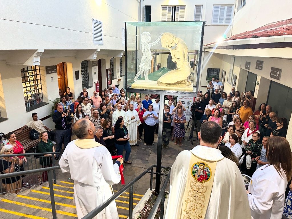 Após a celebração da Santa Missa, todos os presentes se dirigiram em procissão até o pátio interno da Paróquia, que fica ao lado da igreja antiga. A escultura foi instalada neste pátio, entre as escadarias. Após proferir algumas palavras e orações, o Pe. Daniel inaugurou a estátua, jogando água benta sobre ela e os presentes.