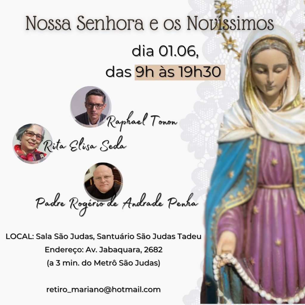 No dia 01 de junho, das 9h às 19h30 haverá na Sala São Judas da Paróquia e Santuário São Judas Tadeu um evento mariano intitulado “Nossa Senhora e os Novíssimos”, com palestras sobre a devoção aos 5 primeiros sábados, Missa, Meditação do Santo Terço, Confissão, Cenáculo – Movimento Sacerdotal Mariano (Home | MSM (msm-mmp.org) e Meditação de uma mensagem do livro: “Aos Sacerdotes, Filhos Prediletos de Nossa Senhora”, Ato de Consagração ao Imaculado Coração de Maria. Haverá Coffee Breack incluso no valor do ingresso. Ingresso: R$125,00 em 01/06/2024. Os ingressos serão vendidos por meio da Plataforma https://www.sympla.com.br/nossa-senhora-e-os-novissimos__2410204