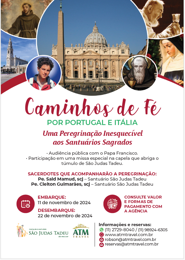 Participe da Peregrinação aos Santuários Sagrados, em Portugal e Itália, com os Padres da Paróquia e Santuário São Judas Tadeu: Pe. Said Mamud, scj e Pe. Cleiton Guimarães, scj, de 11 a 22 de novembro de 2024. Essa é a oportunidade para você estar em audiência pública com o Papa Francisco e participar de uma missa especial na Capela que abriga o túmulo de São Judas Tadeu, Apóstolo e Mártir, no Vaticano.