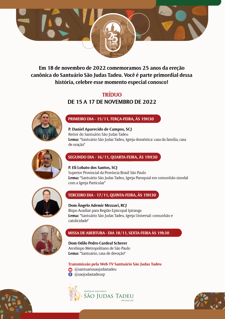 De 15 a 17 de novembro acontece o tríduo, às 19h30 e a Missa de abertura do Ano Jubilar, será no dia 18 de novembro (sexta-feira) às 19h30, na igreja nova, presidida por Dom Odilo Pedro Cardeal Scherer, Arcebispo de São Paulo.