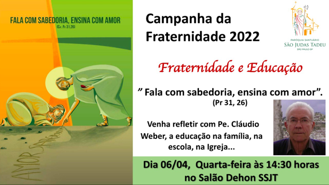 Você terá a oportunidade de refletir e orar sobre este tema no Santuário São Judas Tadeu no dia 6 de abril, quarta-feira, às 14h30. O momento será conduzido pelo padre Cláudio Weber, scj, no Salão Dehon. Participe!
