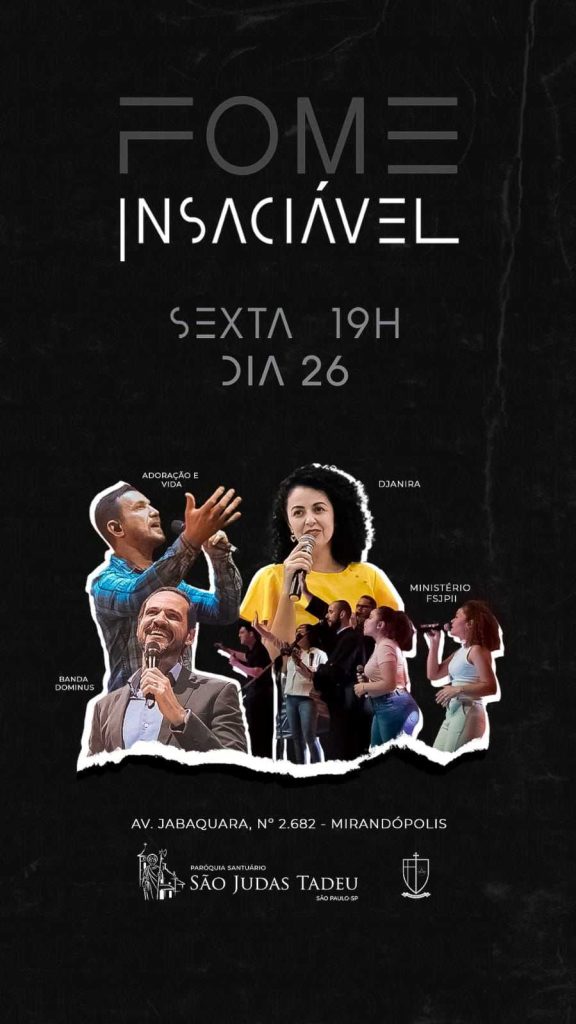 O Santuário São Judas Tadeu vai receber no dia 26 de novembro (sexta-feira), às 19h, o evento “Fome Insaciável”, que faz parte de uma série de apresentações promovida pela FSJPII – Fraternidade São João Paulo II em diversas regiões do Brasil.