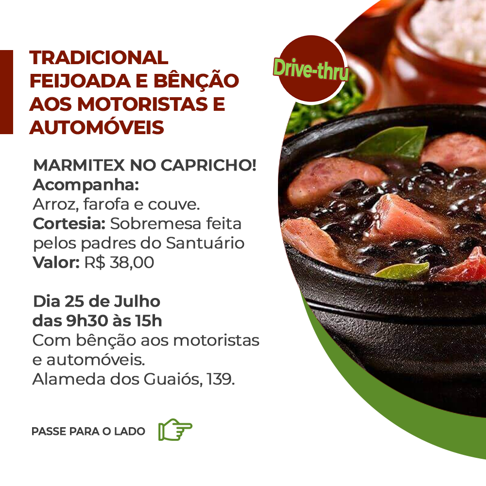 O Santuário convida para sua tradicional FEIJOADA no dia 25 de Julho, memória litúrgica de São Cristóvão, padroeiro dos motoristas. Reserve já a sua na nossa Secretaria Paroquial ou fazendo um PIX (Chave 11 99204-8222) e nos envie o comprovante via WhatsApp para o mesmo número, informando que se trata da compra da Feijoada.